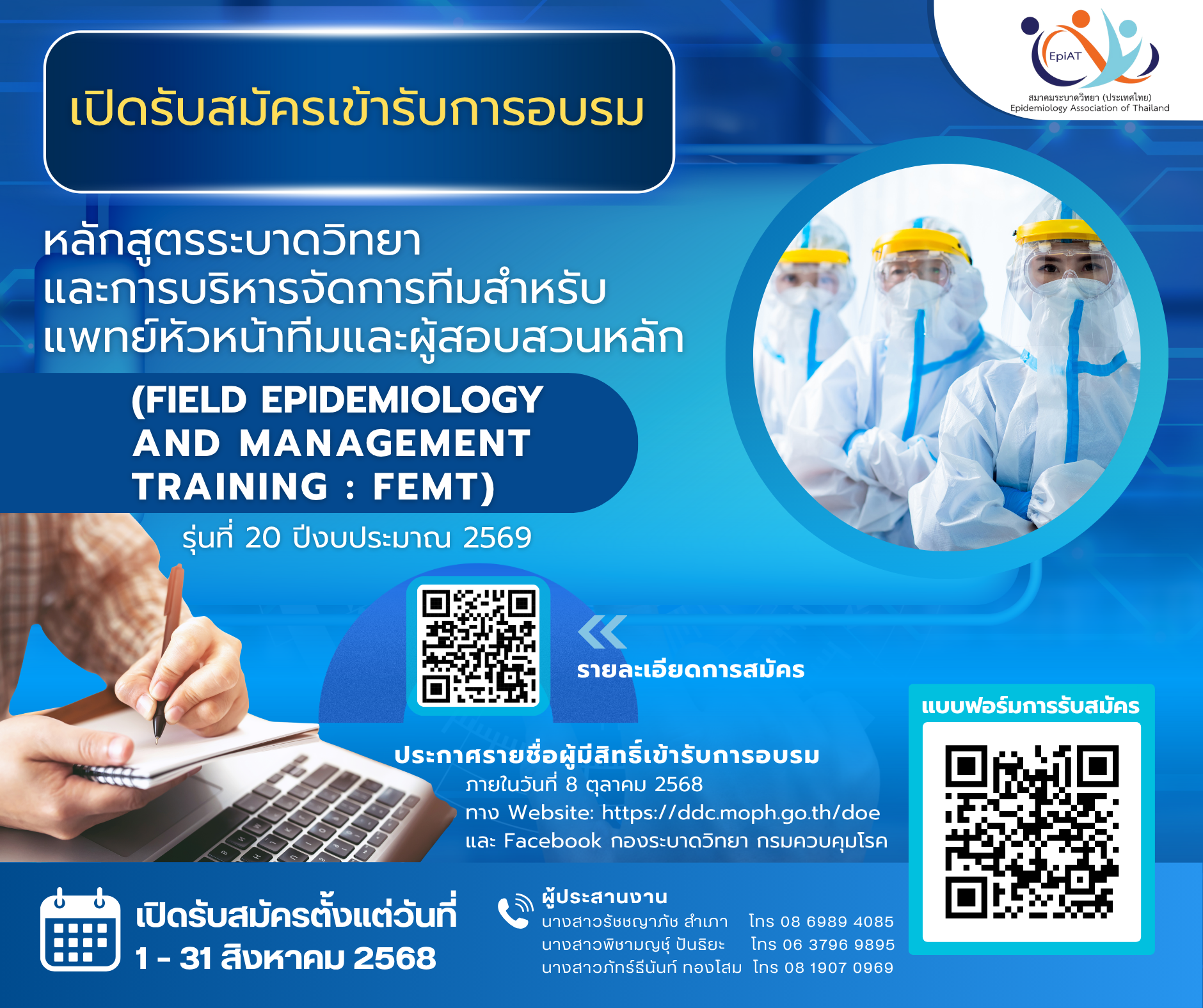 เปิดรับสมัครเข้ารับการอบรมหลักสูตรระบาดวิทยาและการบริหารจัดการทีมสำหรับแพทย์หัวหน้าทีมและผู้สอบสวนหลัก (Field Epidemiology and Management Training : FEMT) รุ่นที่ 20 ปีงบประมาณ 2569
