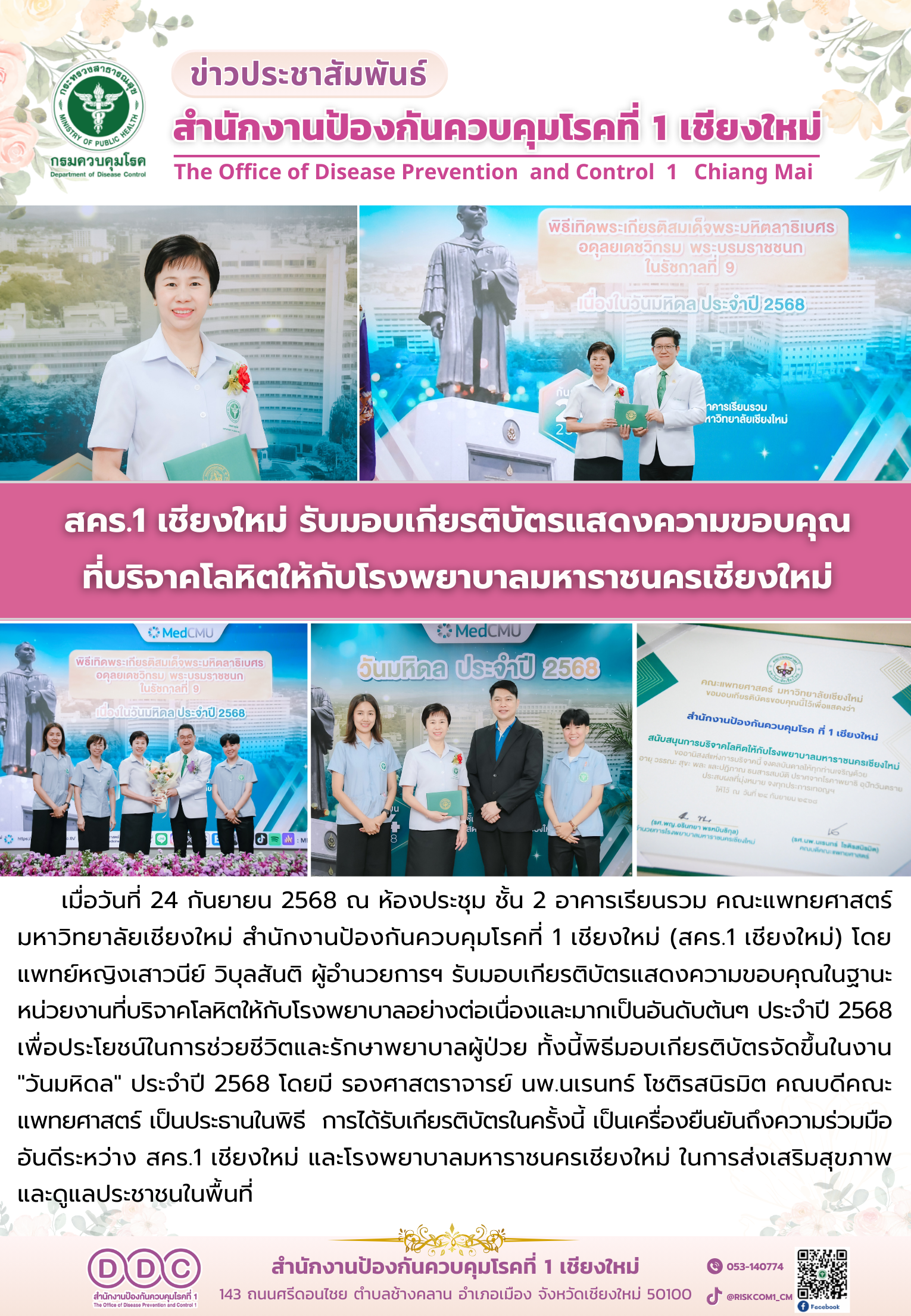 วันที่ 10 ตุลาคม 2568 แพทย์หญิงเสาวนีย์ วิบุลสันติ ผู้อำนวยการสำนักงานป้องกันควบคุมโรคที่ 1 เชียงใหม่ มอบหมายให้นายเกรียงศักดิ์ เพาะโภชน์ รองผู้อำนวยการฯและนายแพทย์วาที สิทธิ รองผู้อำนวยการฯ พร้อมด้วย