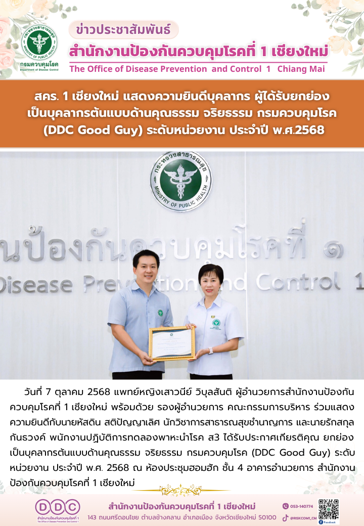 เมื่อวันที่ 24 กันยายน 2568 ณ ห้องประชุม ชั้น 2 อาคารเรียนรวม คณะแพทยศาสตร์มหาวิทยาลัยเชียงใหม่ สำนักงานป้องกันควบคุมโรคที่ 1 เชียงใหม่ (สคร.1 เชียงใหม่) โดยแพทย์หญิงเสาวนีย์ วิบุลสันติ ผู้อำนวยการฯ รับมอบเกียรติบัตรแสดงความขอบคุณในฐานะหน่วยงานที่บริจาคโลหิตให้กับโรงพยาบาลอย่างต่อเนื่องและมากเป็นอันดับต้นๆ ประจำปี 2568เพื่อประโยชน์ในการช่วยชีวิตและรักษาพยาบาลผู้ป่วย ทั้งนี้พิธีมอบเกียรติบัตรจัดขึ้นในงาน"วันมหิดล" ประจำปี 2568 โดยมี รองศาสตราจารย์ นพ.นเรนทร์ โชติรสนิรมิต คณบดีคณะแพทยศาสตร์ เป็นประธานในพิธี การได้รับเกียรติบัตรในครั้งนี้ เป็นเครื่องยืนยันถึงความร่วมมืออันดีระหว่าง สคร.1 เชียงใหม่ และโรงพยาบาลมหาราชนครเชียงใหม่ ในการส่งเสริมสุขภาพและดูแลประชาชนในพื้นที่