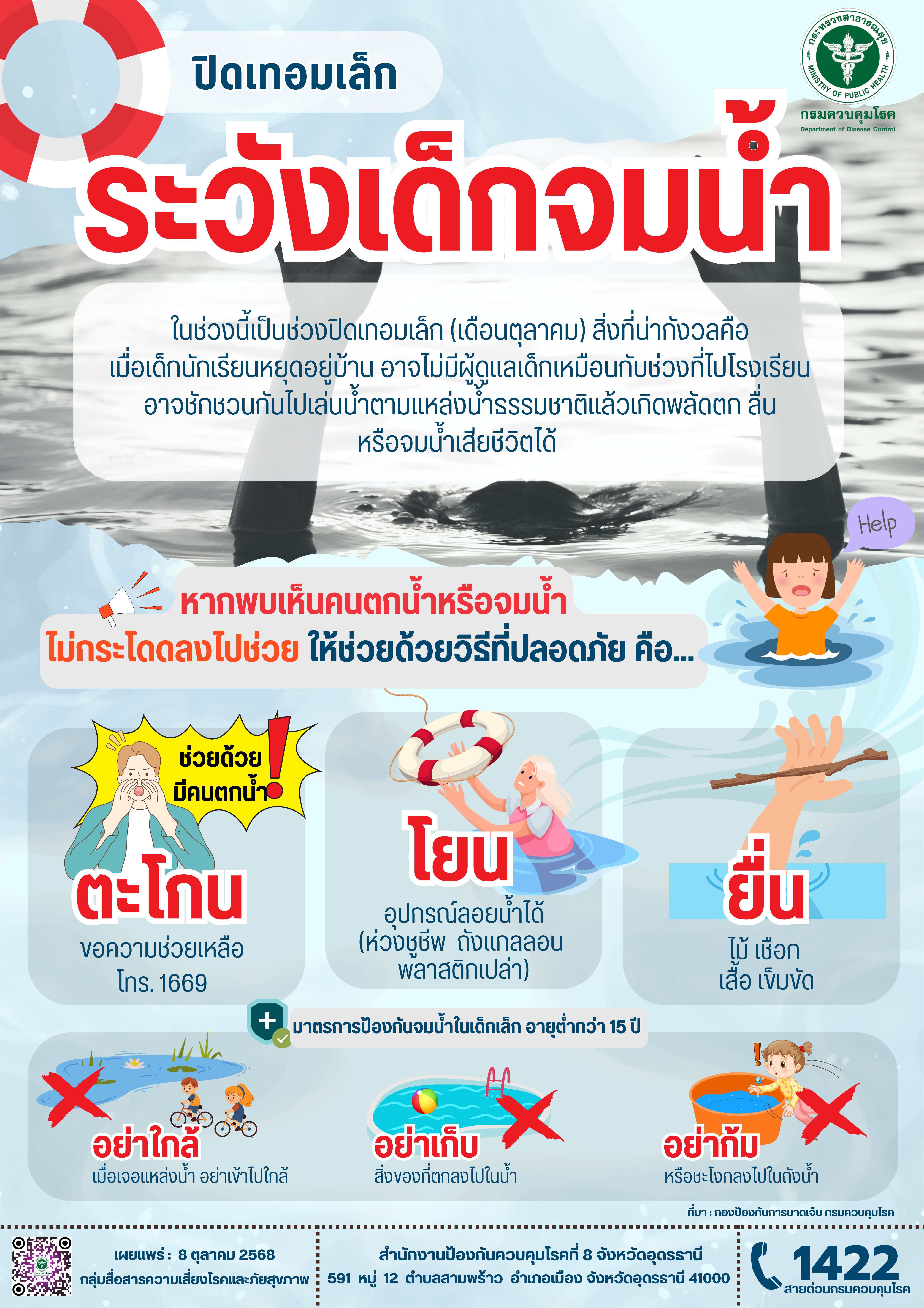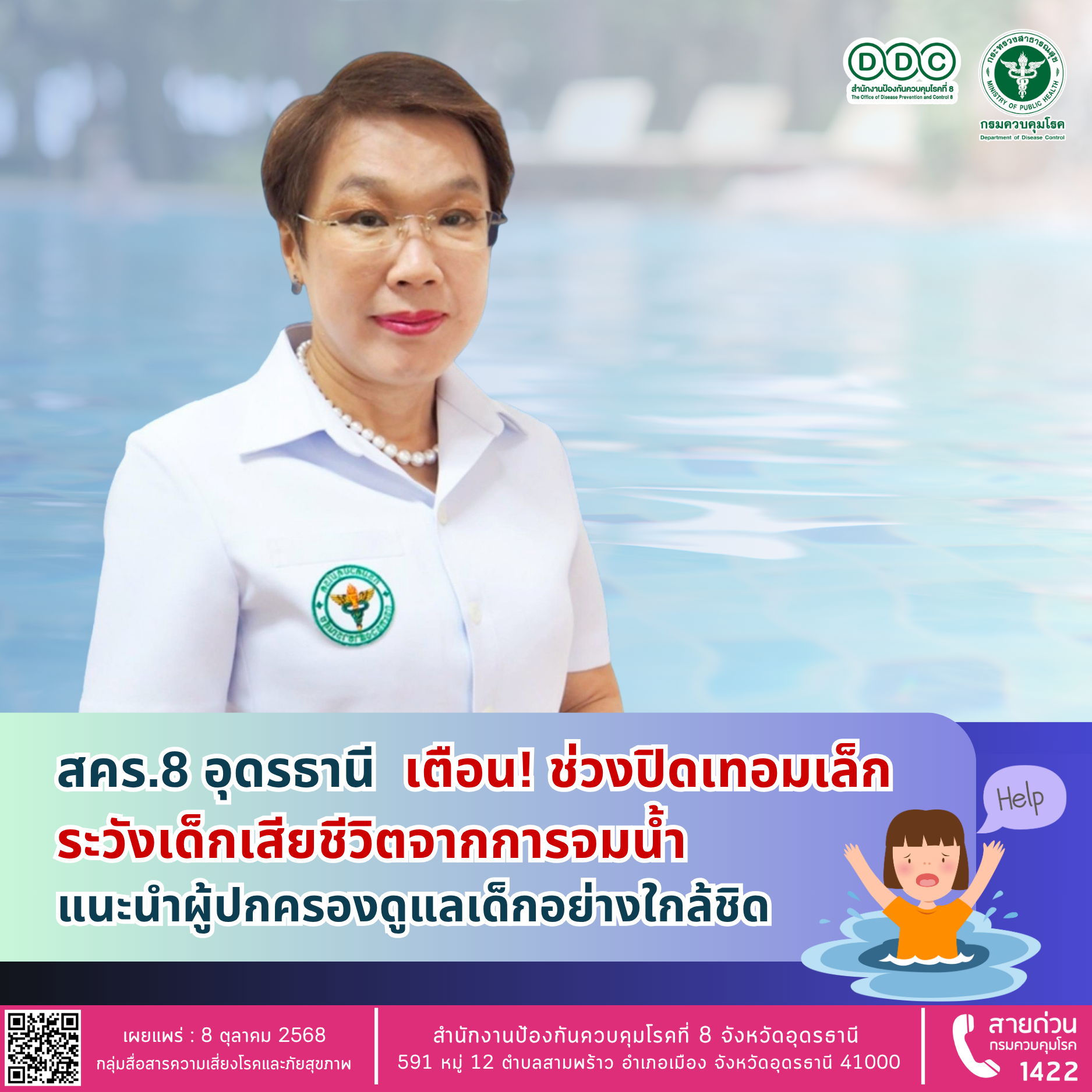 สคร.8 อุดรธานี เตือนช่วงปิดเทอมเล็ก ระวังเด็กเสียชีวิตจากการจมน้ำ แนะนำผู้ปกครองดูแลเด็กอย่างใกล้ชิด