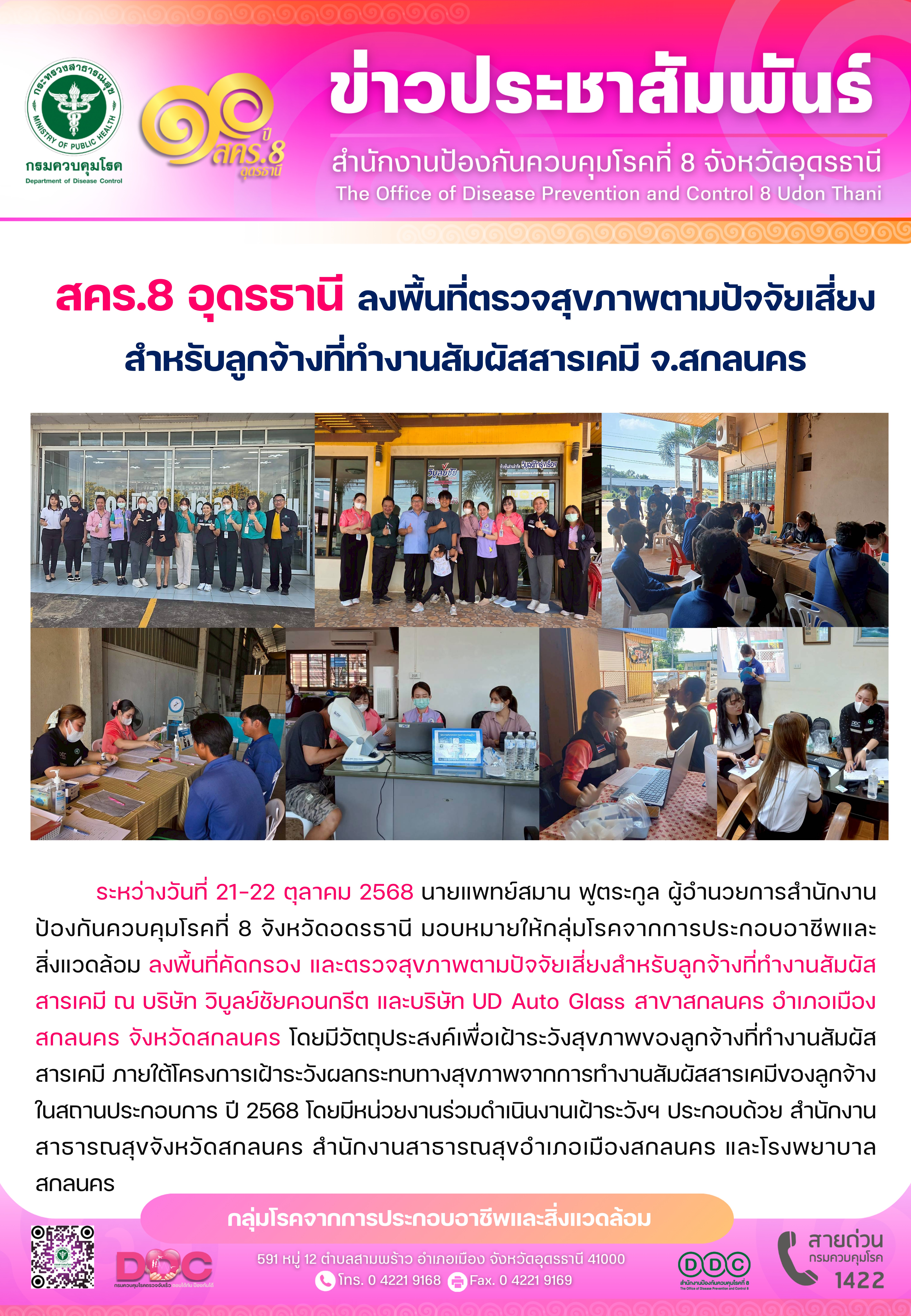 ระหว่างวันที่ 21-22 ตุลาคม 2568 นายแพทย์สมาน ฟูตระกูล ผู้อำนวยการสำนักงานป้องกันควบคุมโรคที่ 8 จังหวัดอุดรธานี มอบหมายให้กลุ่มโรคจากการประกอบอาชีพและสิ่งแวดล้อม ลงพื้นที่คัดกรอง และตรวจสุขภาพตามปัจจัยเสี่ยงสำหรับลูกจ้างที่ทำงานสัมผัสสารเคมี ณ บริษัท วิบูลย์ชัยคอนกรีต และบริษัท UD Auto Glass สาขาสกลนคร อำเภอเมืองสกลนคร จังหวัดสกลนคร โดยมีวัตถุประสงค์เพื่อเฝ้าระวังสุขภาพของลูกจ้างที่ทำงานสัมผัสสารเคมี ภายใต้โครงการเฝ้าระวังผลกระทบทางสุขภาพจากการทำงานสัมผัสสารเคมีของลูกจ้างในสถานประกอบการ ปี 2568 โดยมีหน่วยงานร่วมดำเนินงานเฝ้าระวังฯ ประกอบด้วย สำนักงานสาธารณสุขจังหวัดสกลนคร สำนักงานสาธารณสุขอำเภอเมืองสกลนคร และโรงพยาบาลสกลนคร
