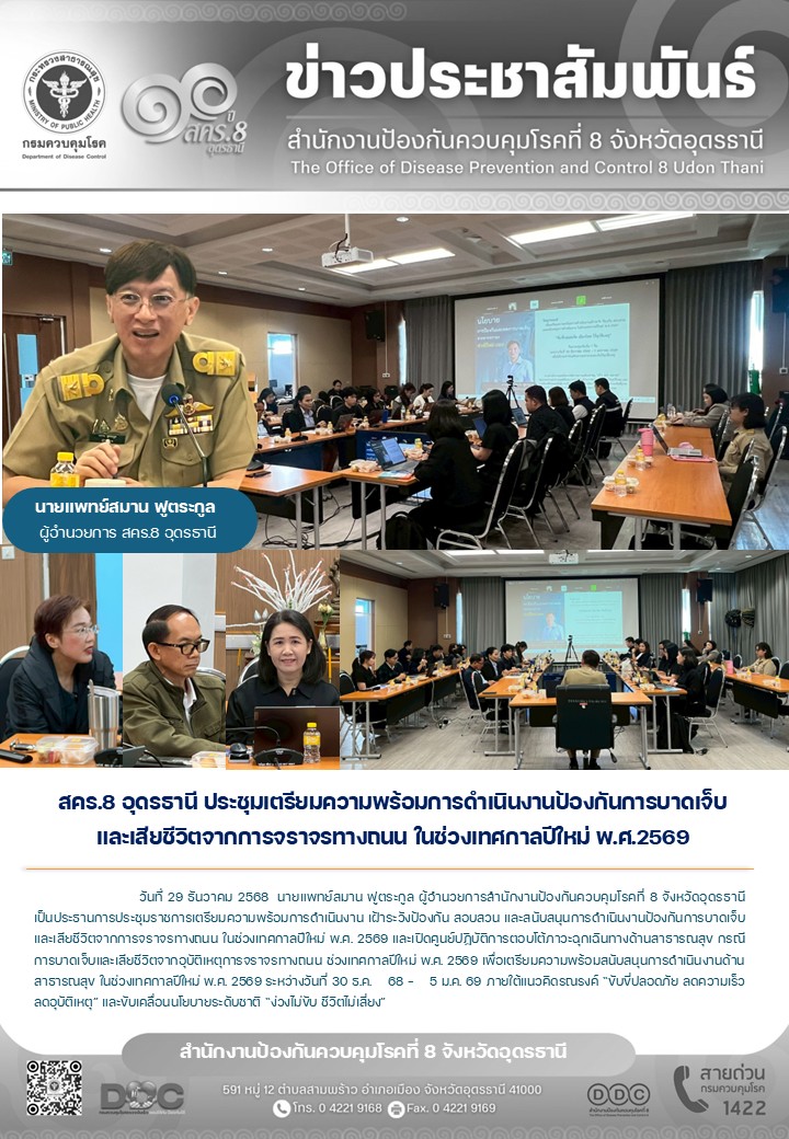 วันที่ 29 ธันวาคม 2568 นายแพทย์สมาน ฟูตระกูล ผู้อำนวยการสำนักงานป้องกันควบคุมโรคที่ 8 จังหวัดอุดรธานี เป็นประธานการประชุมราชการเตรียมความพร้อมการดำเนินงาน เฝ้าระวังป้องกัน สอบสวน และสนับสนุนการดำเนินงานป้องกันการบาดเจ็บและเสียชีวิตจากการจราจรทางถนน ในช่วงเทศทาลปีใหม่ พ.ศ. 2569 และเปิดศูนย์ปฏิบัติการตอบโต้ภาวะฉุกเฉินทางด้านสาธารณสุข กรณีการบาดเจ็บและเสียชีวิตจากอุบัติเหตุการจราจรทางถนน ช่วงเทศกาลปีใหม่ พ.ศ. 2559 เพื่อเตรียมความพร้อมสนับสนุนการดำเนินงานด้านสาธารณสุข ในช่วงเทศกาลปีใหม่ พ.ศ. 2569 ระหว่างวันที่ 30 ธ.ค. 68 - 5 ม.ค. 69 ภายใต้แนวคิดรณรงค์ "ขับขี่ปลอดภัย ลดความเร็ว ลดอุบัติเหตุ" และขับเคลื่อนโยบายระดับชาติ "ง่วงไม่ขับ ชีวิตไม่เสี่ยง"