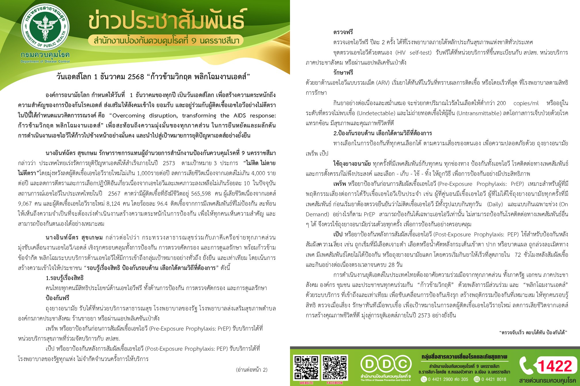 องค์การอนามัยโลก กำหนดให้วันที่ 1 ธันวาคมของทุกปี เป็นวันเอดส์โลก เพื่อสร้างความตระหนักถึงความสำคัญของการป้องกันโรคเอดส์ ส่งเสริมให้สังคมเข้าใจ ยอมรับ และอยู่ร่วมกับผู้ติดเชื้อเอชไอวีอย่างไม่ตีตรา ในปีนี้ได้กำหนดแนวคิดการรณรงค์ คือ “Overcoming disruption, transforming the AIDS response: ก้าวข้ามวิกฤต พลิกโฉมงานเอดส์” เพื่อสะท้อนถึงความมุ่งมั่นของทุกภาคส่วนในการยืนหยัดและผลักดันการดำเนินงานเอชไอวีให้ก้าวไปข้างหน้าอย่างมั่นคง และนำไปสู่เป้าหมายการยุติปัญหาเอดส์อย่างยั่งยืน