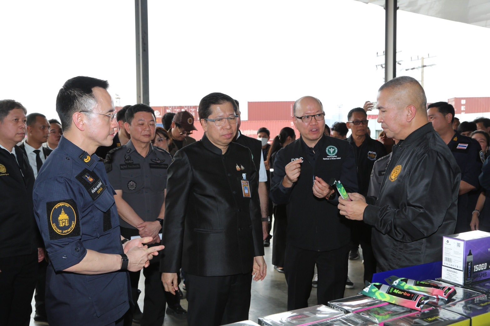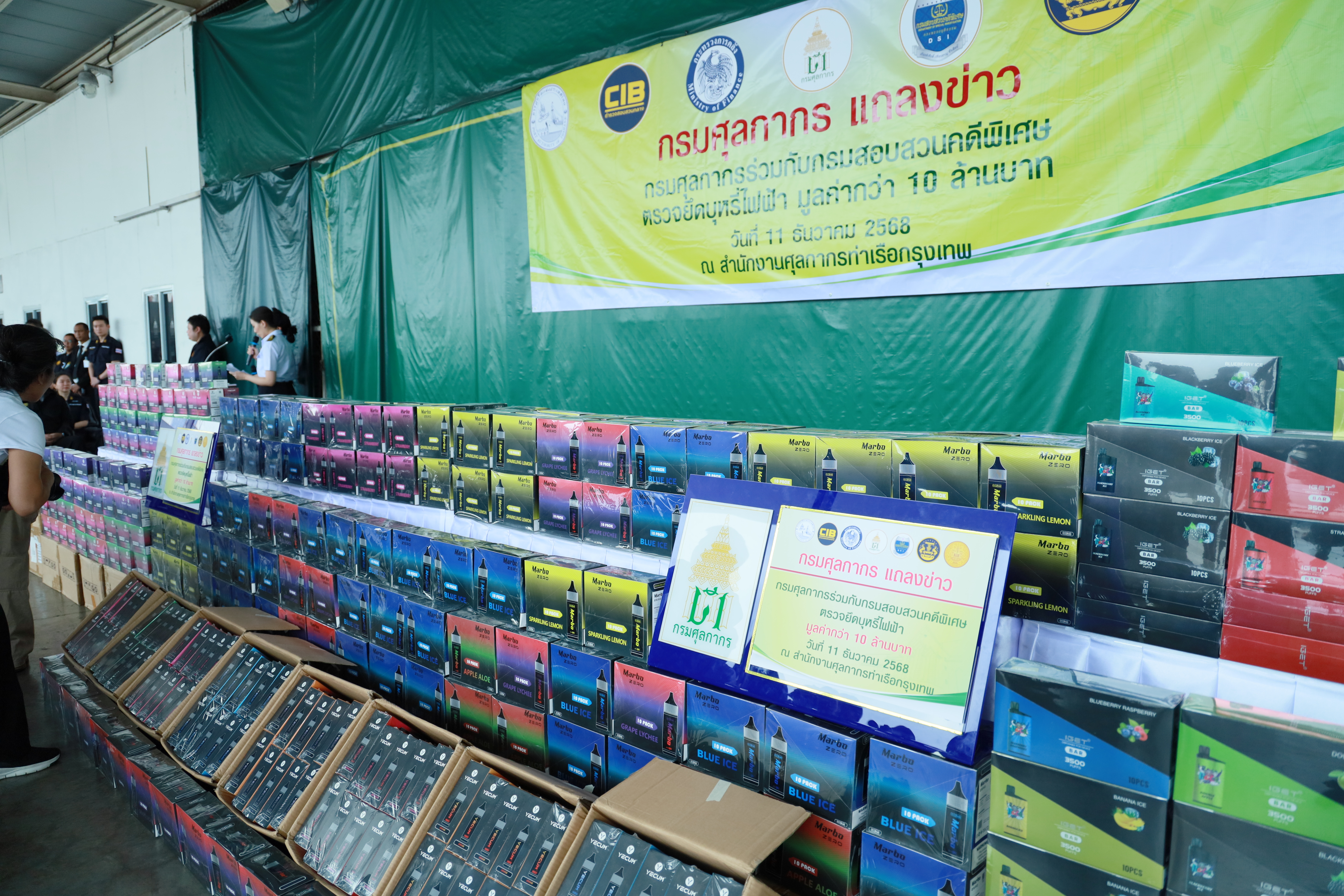 วานนี้(11 ธ.ค. 68) ณ สำนักงานศุลกากรท่าเรือกรุงเทพ นายสันติ ปิยะทัต รัฐมนตรีประจำสำนักนายกรัฐมนตรี พล.ต.ท.รุทธพล เนาวรัตน์ รัฐมนตรีว่าการกระทรวงยุติธรรม ผศ.อัครนันท์ อริยศรีพงษ์ ที่ปรึกษารัฐมนตรีช่วยว่าการกระทรวงสาธารณสุข นางสาวพิมพ์สุดา เพ็ญแสง ผู้ช่วยเลขานุการรัฐมนตรีว่าการกระทรวงสาธารณสุข พร้อมด้วยนายแพทย์ชยนันท์ สิทธิบุศย์ รักษาการนายแพทย์ทรงคุณวุฒิฯ และผู้อำนวยการกองงานคณะกรรมการควบคุมผลิตภัณฑ์ยาสูบ กรมควบคุมโรค ผู้บริหารจากกรมศุลกากร กรมสอบสวนคดีพิเศษ กองบัญชาการตำรวจสอบสวนกลาง และการท่าเรือแห่งประเทศไทย ร่วมแถลงข่าวผลการตรวจยึดบุหรี่ไฟฟ้าชนิดใช้แล้วทิ้งจำนวน 46,260 ชิ้น มูลค่ารวม 10,871,100 บาท