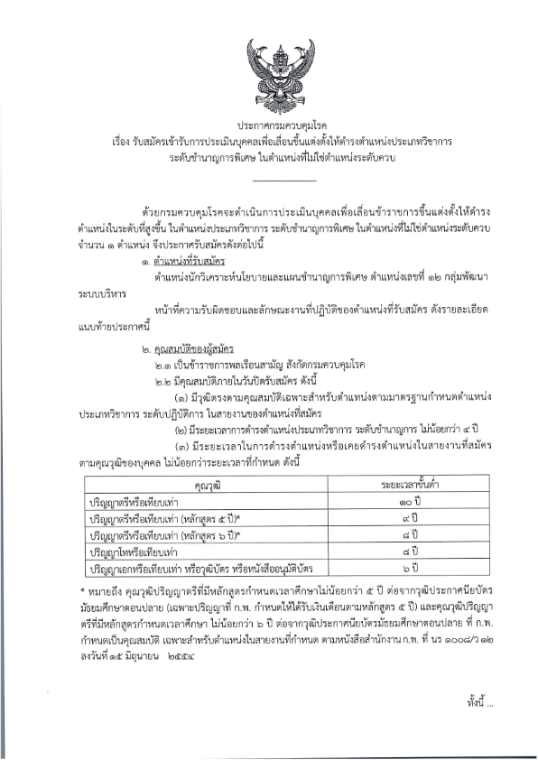 กลุ่มพัฒนาระบบบริหาร กรมควบคุมโรค มีความประสงค์จะรับย้ายข้าราชการ ตำแหน่งนักวิเคราะห์นโยบายและแผนระดับชำนาญการพิเศษ