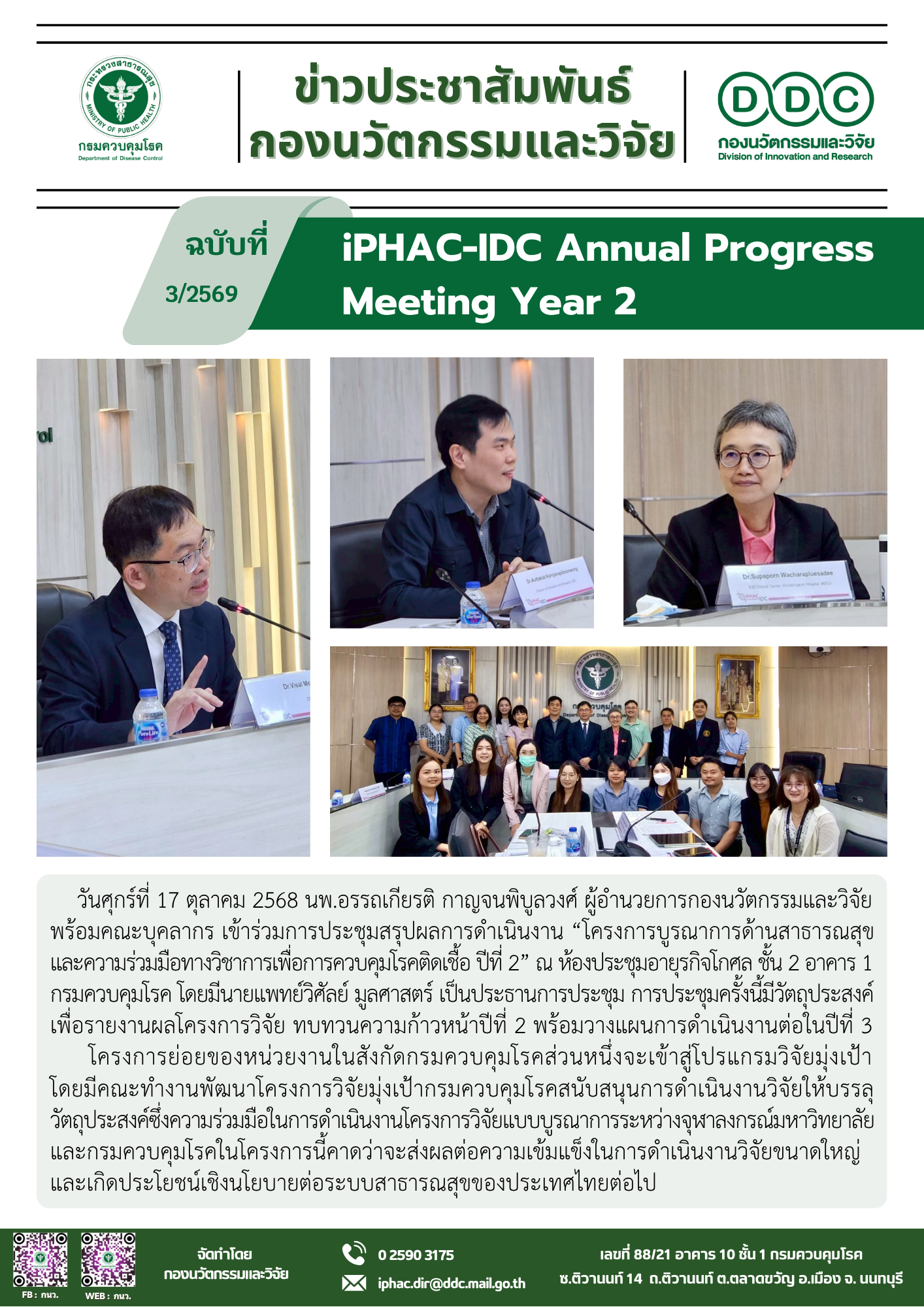 วันศุกร์ที่ 17 ตุลาคม 2568 นพ.อรรถเกียรติ กาญจนพิบูลวงศ์ ผู้อำนวยการกองนวัตกรรมและวิจัย พร้อมคณะบุคลากร เข้าร่วมการประชุมสรุปผลการดำเนินงาน “โครงการบูรณาการด้านสาธารณสุขและความร่วมมือทางวิชาการเพื่อการควบคุมโรคติดเชื้อ ปีที่ 2” ณ ห้องประชุมอายุรกิจโกศล ชั้น 2 อาคาร 1 กรมควบคุมโรค