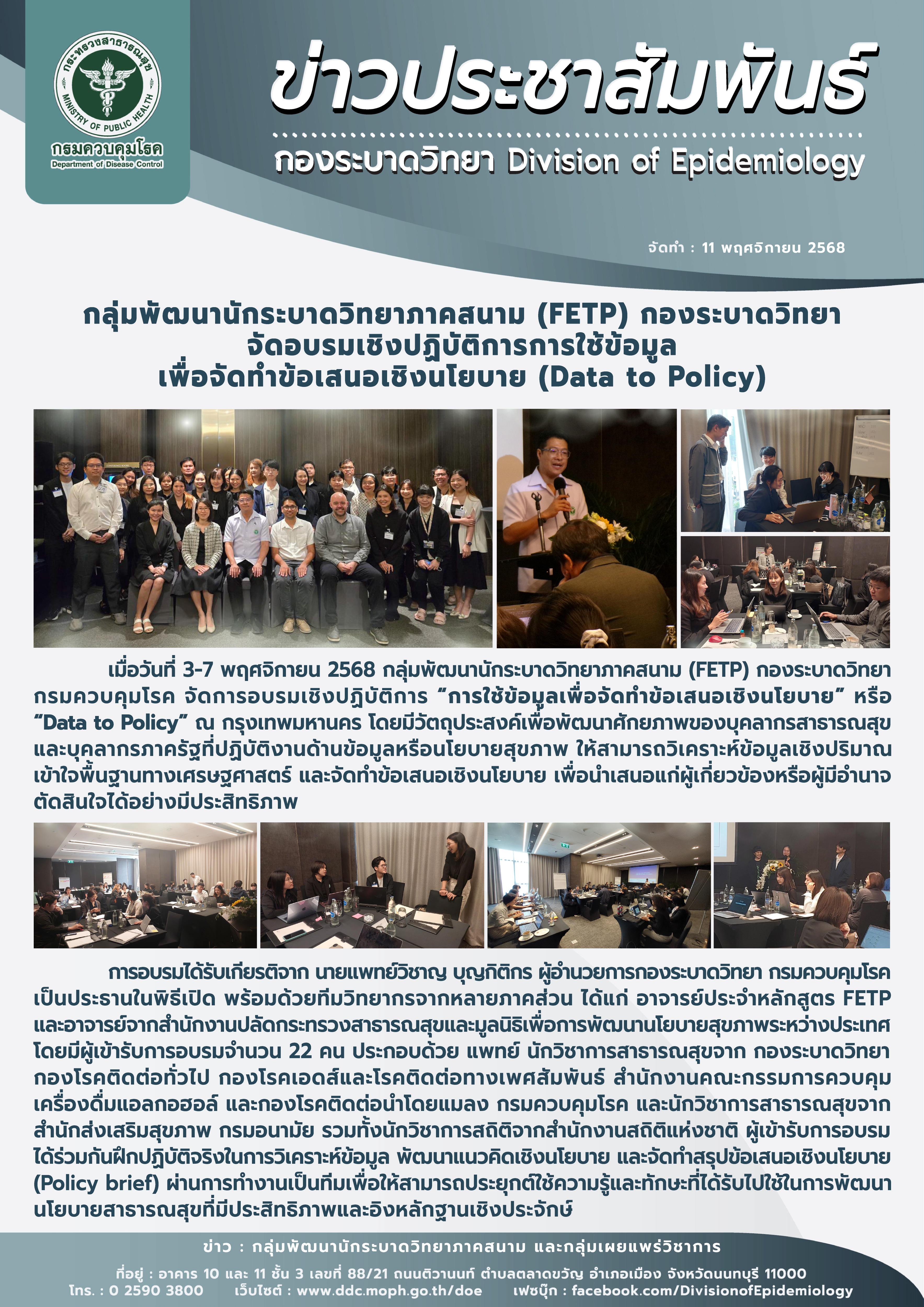 กลุ่มพัฒนานักระบาดวิทยาภาคสนาม (FETP) กองระบาดวิทยา จัดอบรมเชิงปฏิบัติการการใช้ข้อมูลเพื่อจัดทำข้อเสนอเชิงนโยบาย (Data to Policy)